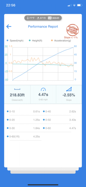 I see this as a real world test and I am haunted by DA. It was consistently 3600 ft. What this means is there is more to be had. I did about 8 runs with my first being 4.78 sec. Getting on a prepped surface will give a bit better gauge as to where I am. Since this was on a long stretch, country road, there was not much traction. I meant to take air out of the tires because the are sitting at 39 PSI all around. a few less PSI and I'll hook a better. A little wheel spin helps and not having any wheel spin can bog the motor.